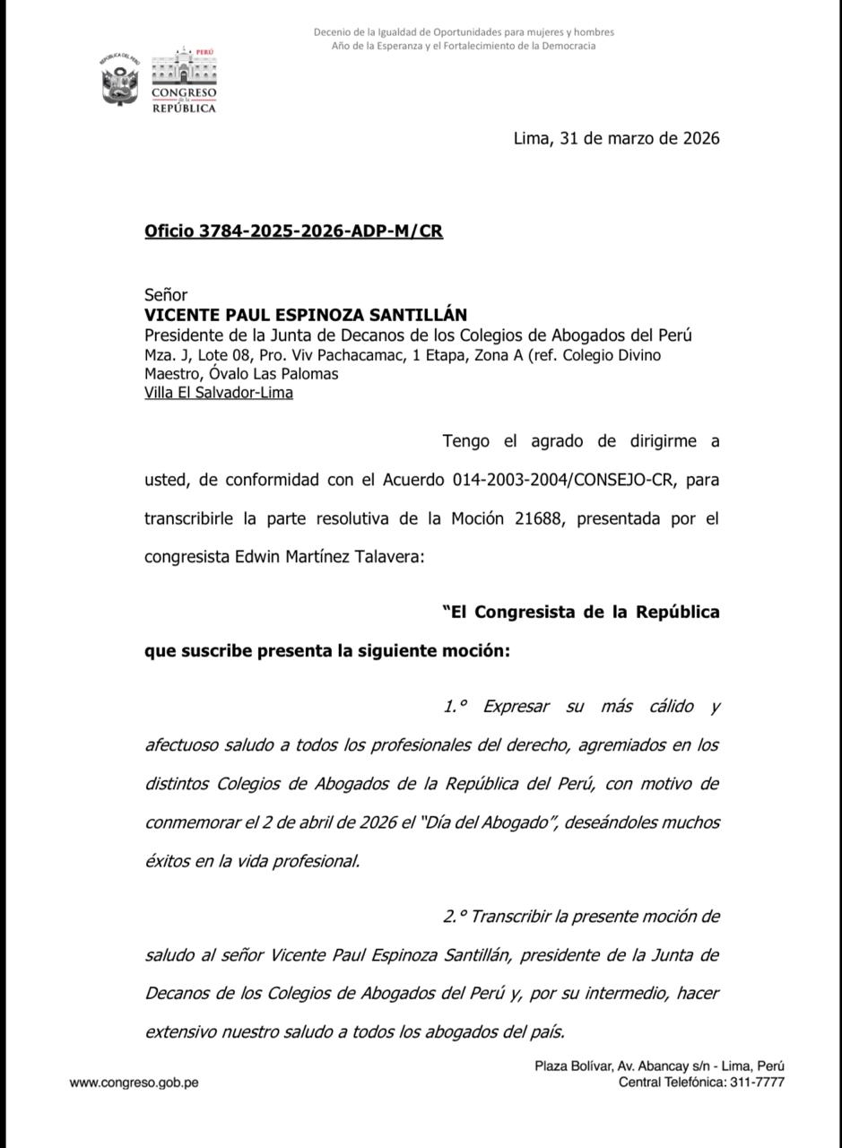 Compartimos saludos de los Colegios de Abogados y Colegios Profesionales del Perú, por motivo del día de la abogacía peruana. 02/04/2026 No hay comentarios