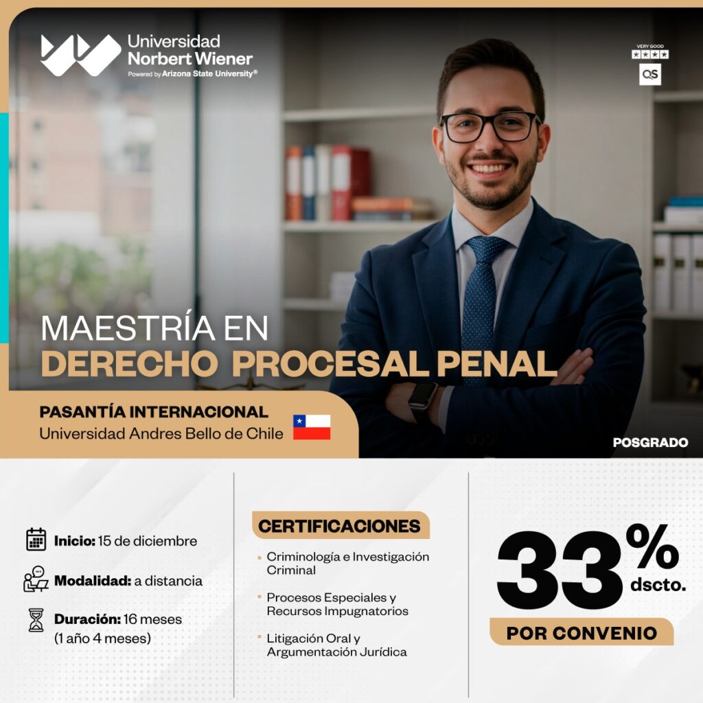 El Ilustre Colegio de Abogados de Lima Sur informa que, en virtud del convenio con la Universidad Privada Norbert Wiener, se viene impulsando la Maestría en Derecho Procesal Penal, un programa orientado a fortalecer las competencias técnicas y estratégicas de los abogados, con énfasis en la litigación oral, la argumentación jurídica y la conducción eficaz de los procesos penales.