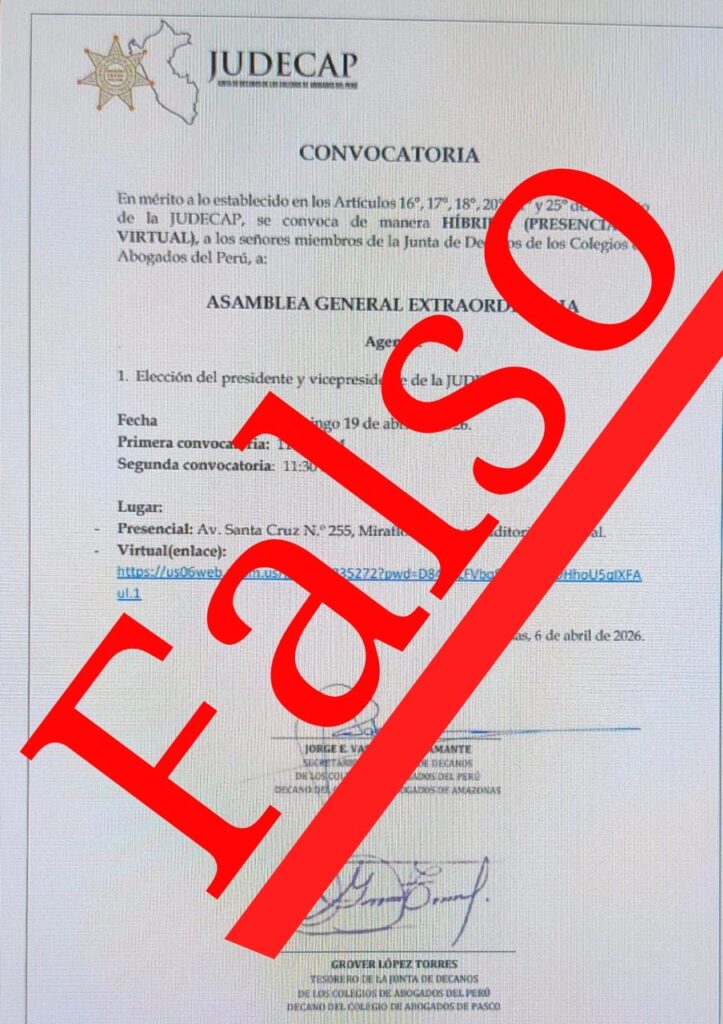 La Junta de Decanos de los Colegios de Abogados del Perú comunica a la comunidad jurídica que la convocatoria a la Asamblea ha sido debidamente verificada, precisándose su autenticidad y validez.