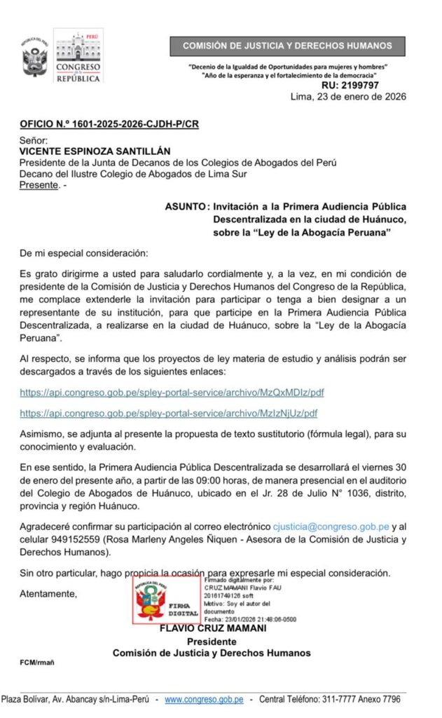 La Junta de Decanos de los Colegios de Abogados del Perú, se reunió en Asamblea General Ordinaria con la participación de diferentes Decanos, tratando entre otros temas la Ley de la Abogacía Peruana, para lo cual participó el Presidente de la Comisión de Justicia y Derechos Humanos, Congresita Flavio Cruz Mamani (Puno), quien se comprometió […]